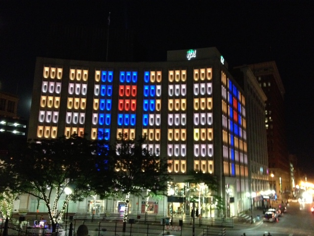 The air is sizzling with excitement in downtown Indianapolis tonight. Although it is kind of quiet you can still feel the energy in the air. Along all the parade routes bleachers are set up and folding chairs are stacked everywhere. Many people are out on foot since there is no place to park downtown and they are enjoying all the views of the city. I hope when I get home I will discover my pictures of all turnout okay. I have never quite figured out how to do the evening shots or night time shots.
