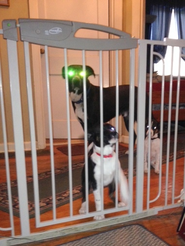Last night, I returned home to find the gate closed. Chief, who can easily jump the gate, was in the living room. Harrigan was with him. Bailey was in the kitchen, yelping because she could not be teamed with the others.