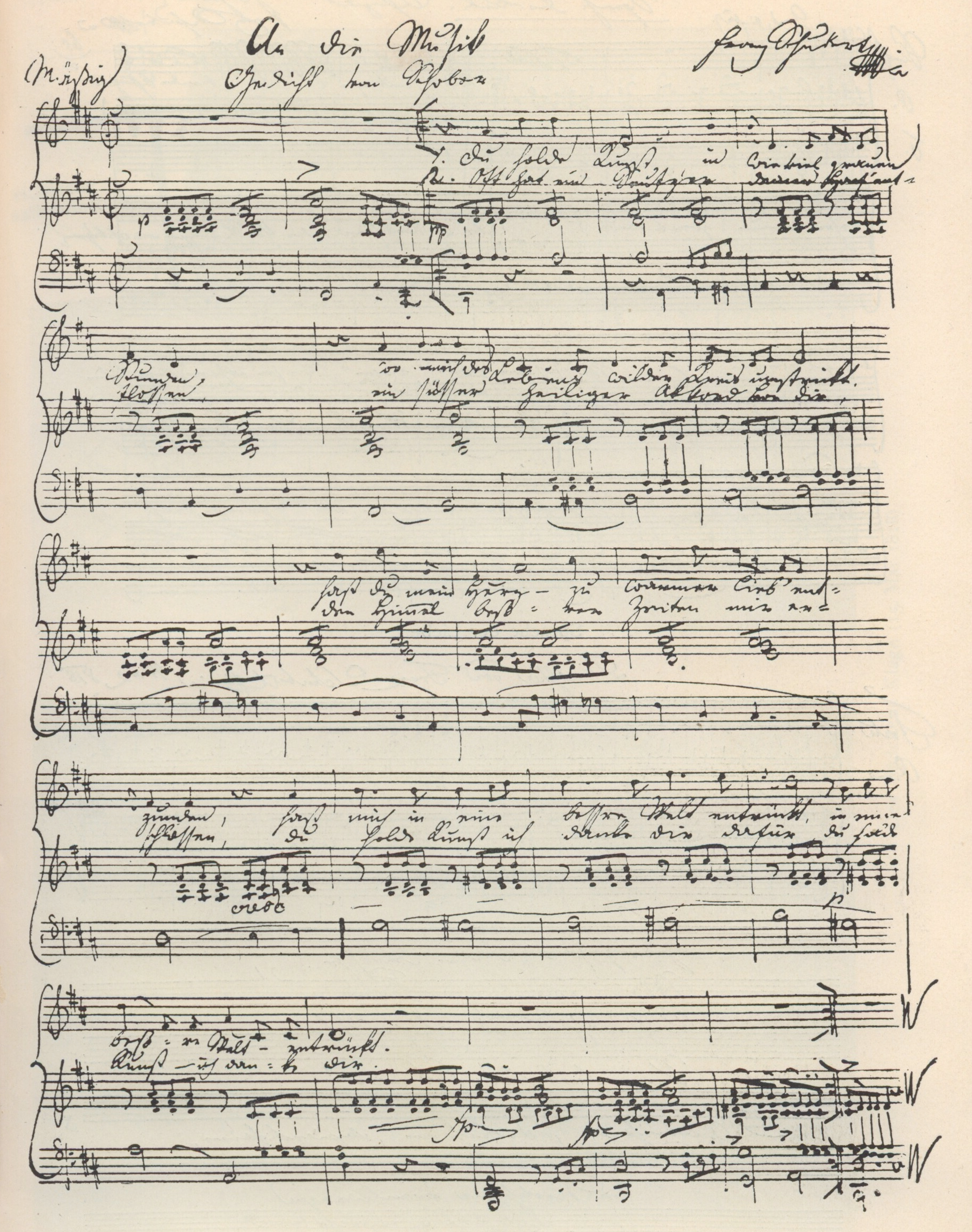 | Du holde Kunst, in wieviel grauen Stunden, Wo mich des Lebens wilder Kreis umstrickt, Hast du mein Herz zu warmer Lieb’ entzunden, Hast mich in eine beßre Welt entrückt! Oft hat ein Seufzer, deiner Harf’ entflossen, |