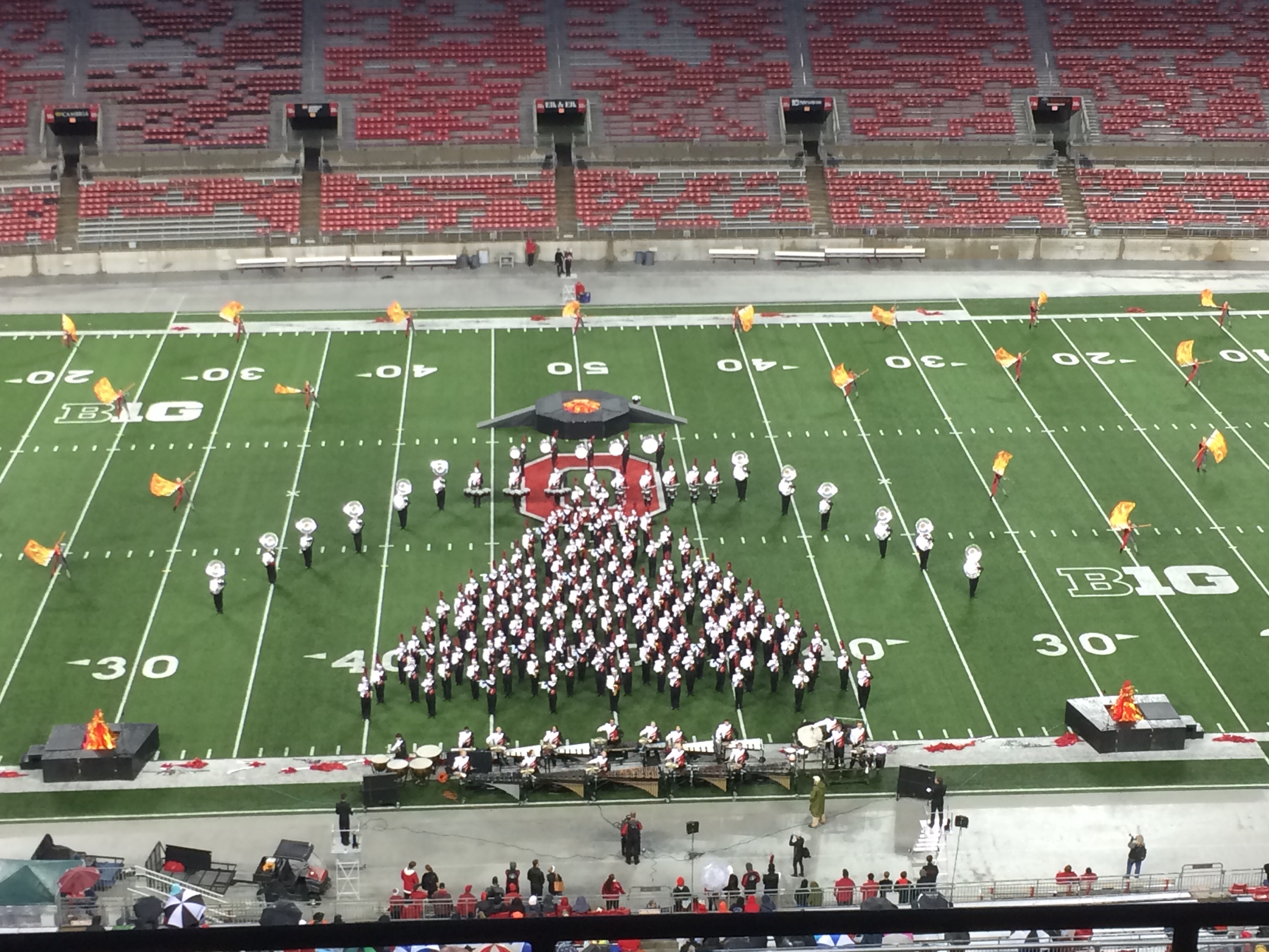 I arrived at the Ohio State University horse shoe/football stadium with 30 minutes to spare before seeing Avon high school marching band, directed by one of my all-time favorite people, Aaron Jacobs. At the ticket booth, I was told, “cash only.” By this time it was 3:40 PM. The gentleman told me there was an ATM several blocks away at the hotel. I honestly do not know how I managed it, but through the rain I went to the hotel, and back to the stadium, actually making it to a seat on C deck as Aaron’s band was taking the field for warm-up.