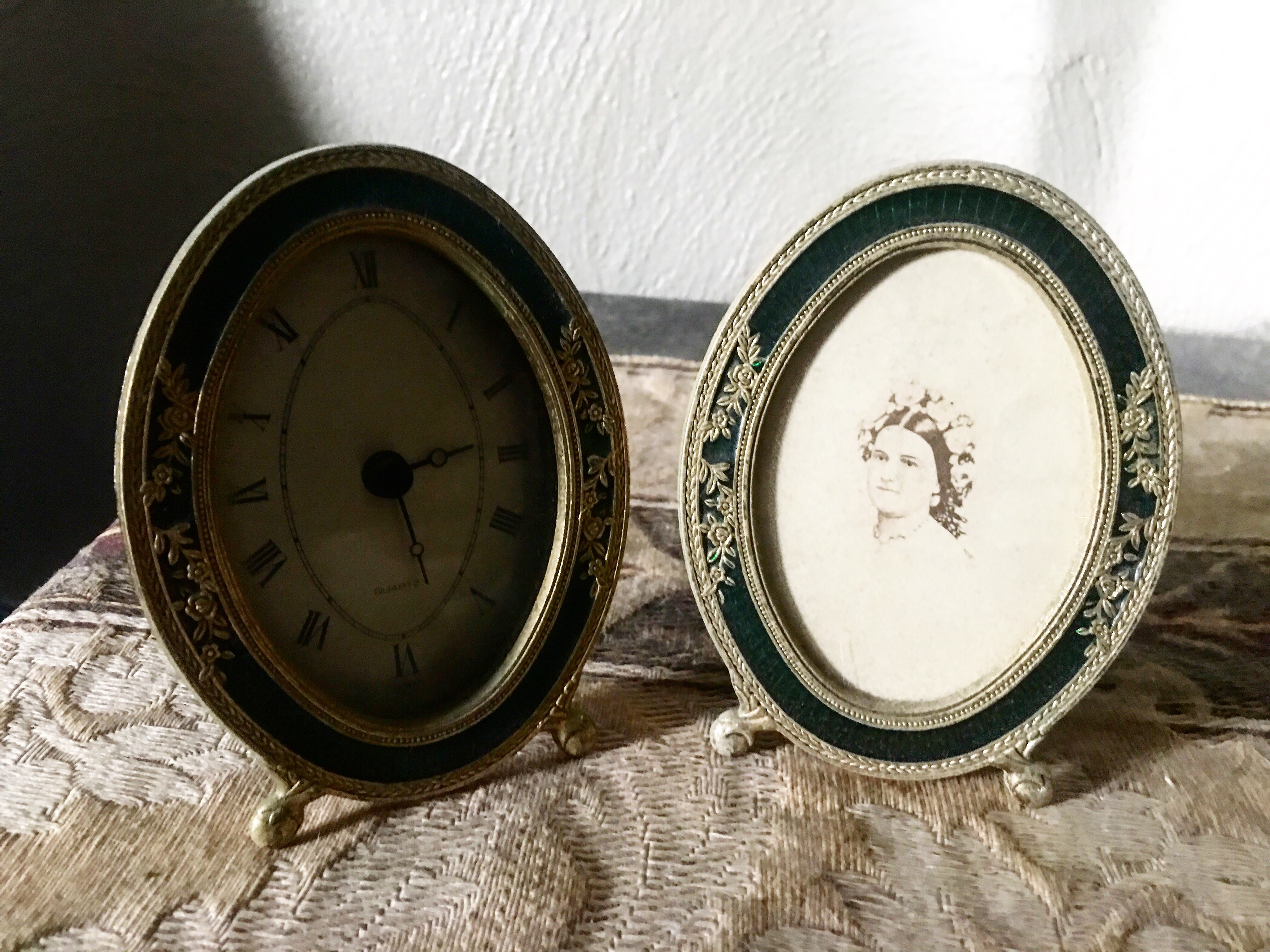 My grandmother, Donna Mae Clary Barmes, bought me an emerald embedded clock, and a frame for my Mary Lincoln card d’visite.