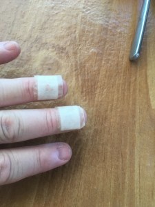 - Went to move a large plastic fan in the basement, and the front fell off; I went to catch it, and the plastic blades caught two fingers on the left hand…. turpentine, antibacterial ointment, and bandaides: still smiling and laughing – I still have my fingers intact