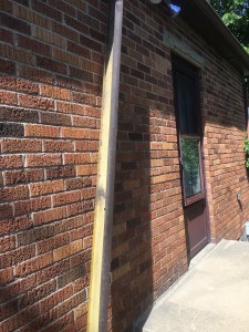 - The wind pulled down some strip of wood or covering from beneath the eaves: still smiling and laughing – we still have the roof **