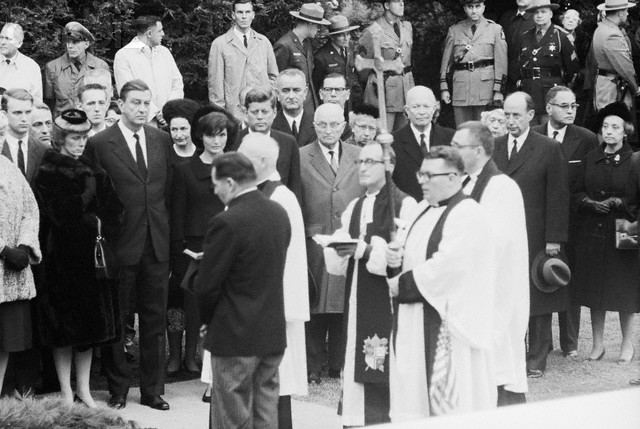 11 Nov 1962, New York State, USA — Original caption: Three Presidents were among mourners at graveside services for Mrs. Franklin D. Roosevelt at Roosevelt esate in Hyde Park November 10. From left to right are Jacqueline Kennedy, President John F. Kennedy, Vice President Lyndon B. Johnson, former President Harry S. Truman, Bess Truman, and former President Dwight D. Eisenhower. — Image by © Bettmann/CORBIS