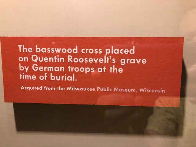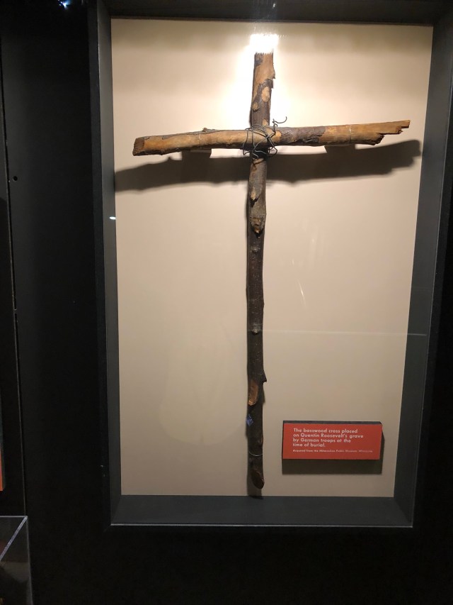 Eleven years after the World War II American Cemetery was established in France at Colleville-sur-Mer, Quentin’s body was exhumed and moved there. In 1955. Quentin’s remains were moved in order to be buried next to his eldest brother Ted, who had died of a heart attack in France in 1944, shortly after leading his troops in landings on Utah Beach on D-Day as Assistant 4th Infantry Division Commander (an act which would earn him the Medal of Honor). Quentin’s original gravestone was moved to Sagamore Hill to serve as a cenotaph for the President’s son. The German-made basswood cross that marked Quentin’s original gravesite is on display at the National Museum of the United States Air Force, at Wright-Patterson Air Force Base, in Dayton Ohio.