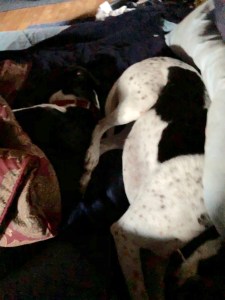 The photo is hard to define but Harrigan and Bailey are snuggling, feet to head, next to me. It was easy to pet them while sleeping.