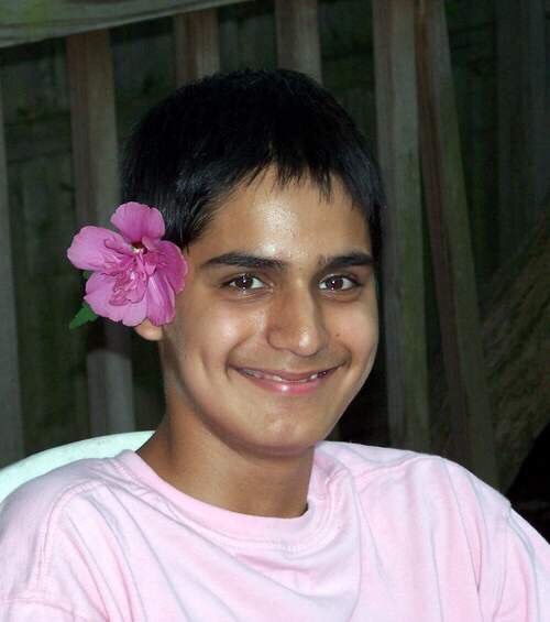 I have included a favorite photo of Son No. 3 with a Rose of Sharon bloom.