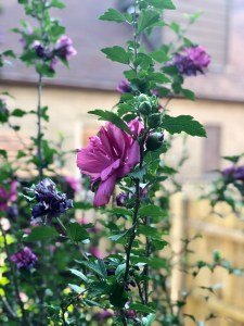 Three Mary Lincoln day lilies are here for a short while but my Rose if Sharon is in full bloom and with hundreds of buds waiting to explode.