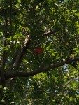 The singing cardinal is performing in the tree near the deck.