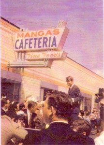 During his visit, Senator Kennedy and his entourage dined at Mangas Cafeteria on the northwest corner of Main and Anderson streets.