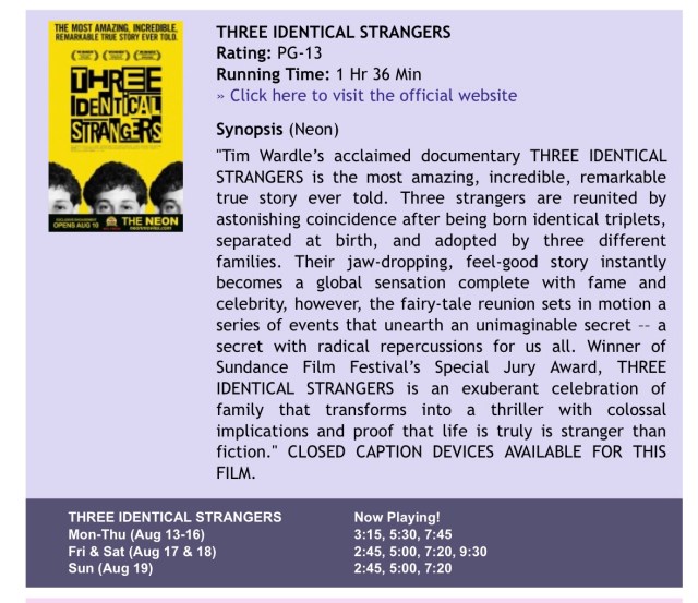 I ended the day at the Neon Theatre downtown Dayton to see an incredibly powerful documentary, THREE IDENTICAL STRANGERS.