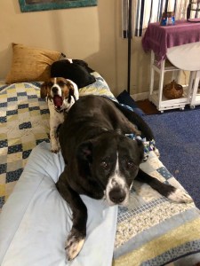 The pooches were not happy to see me leave. Chief loves some extra pillows I once used in my room and since I had tossed one on the guest bed he hopped right onto the bed.