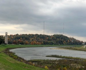 Bus #17 let me off at Springhouse Drive and Far Hills Avenue where I hiked over to The Great Miami River to grab some distant shots of Carillon Park framed by the beautifully autumn quilt rising up behind it.