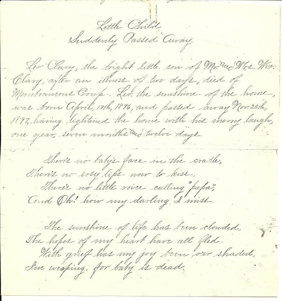 This poem was written by my great-great-grandmother, Mary Frances Noble Clary, following the loss of her infant son, Leo.