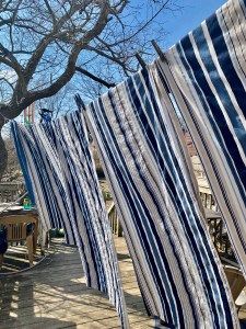 I finished teaching my online classes at 12:40 PM and threw a bunch of curtains from my bedroom and ones I had used in my upstairs bedroom into the wash. I decided to make a change in my study by replacing the heavy burgundy and taupe draperies with the more cheerful blue stripes I’d used upstairs. When finished in the wash, they went on the line over the deck.