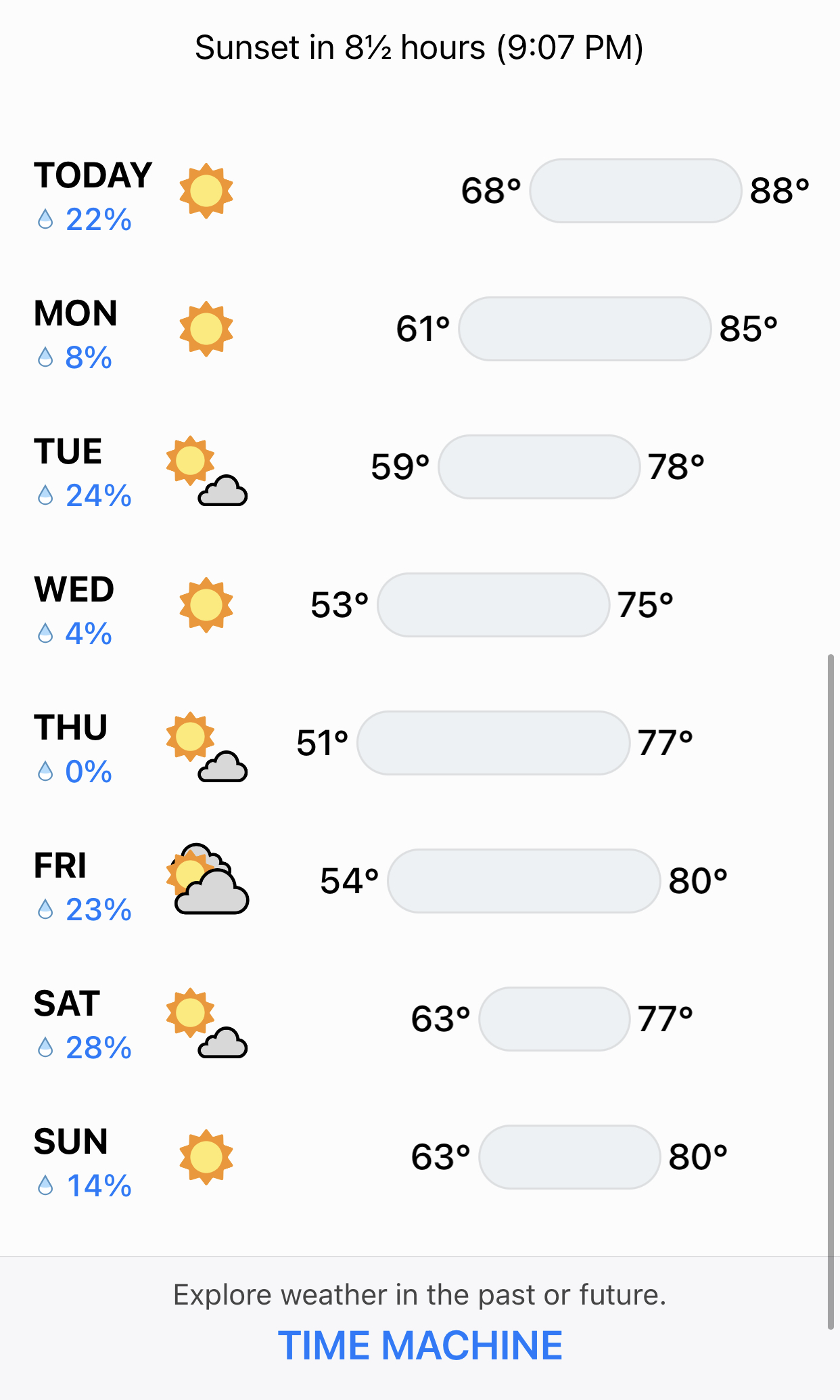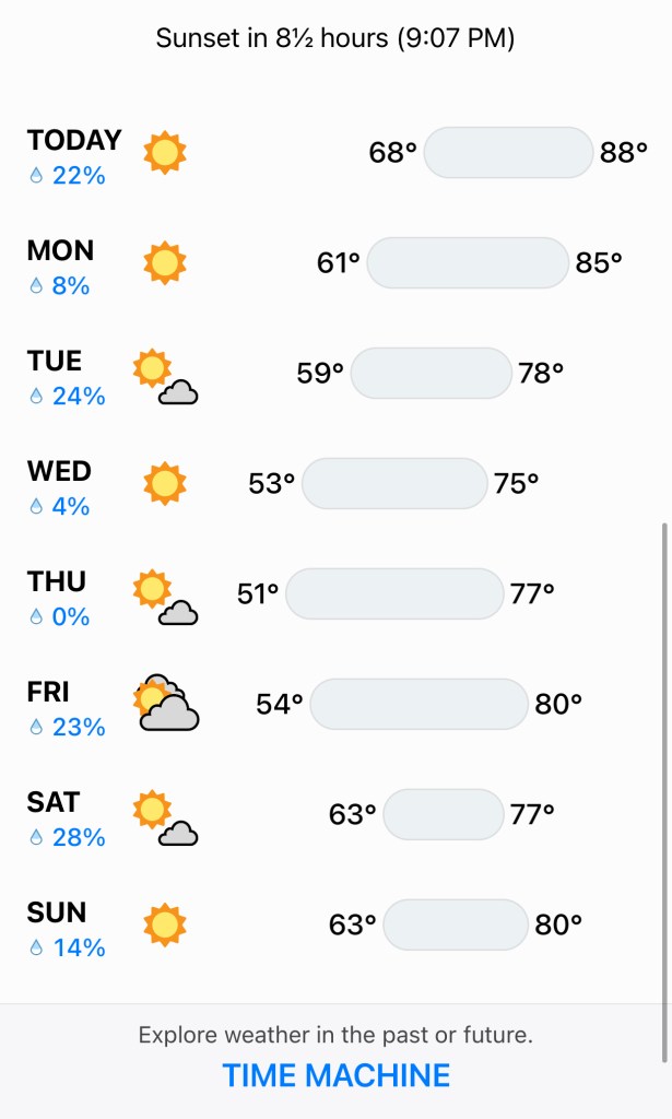 I am in my air-conditioned study, steering clear of the 85-degrees temperature. The humidity, thank heavens, has dropped to 61%, soon to be 48%, and rising back to the 60s and 80s throughout the morning. Tomorrow takes up back to 80-degrees and the remainder of the week will see us through the upper 70s which I find ideal.