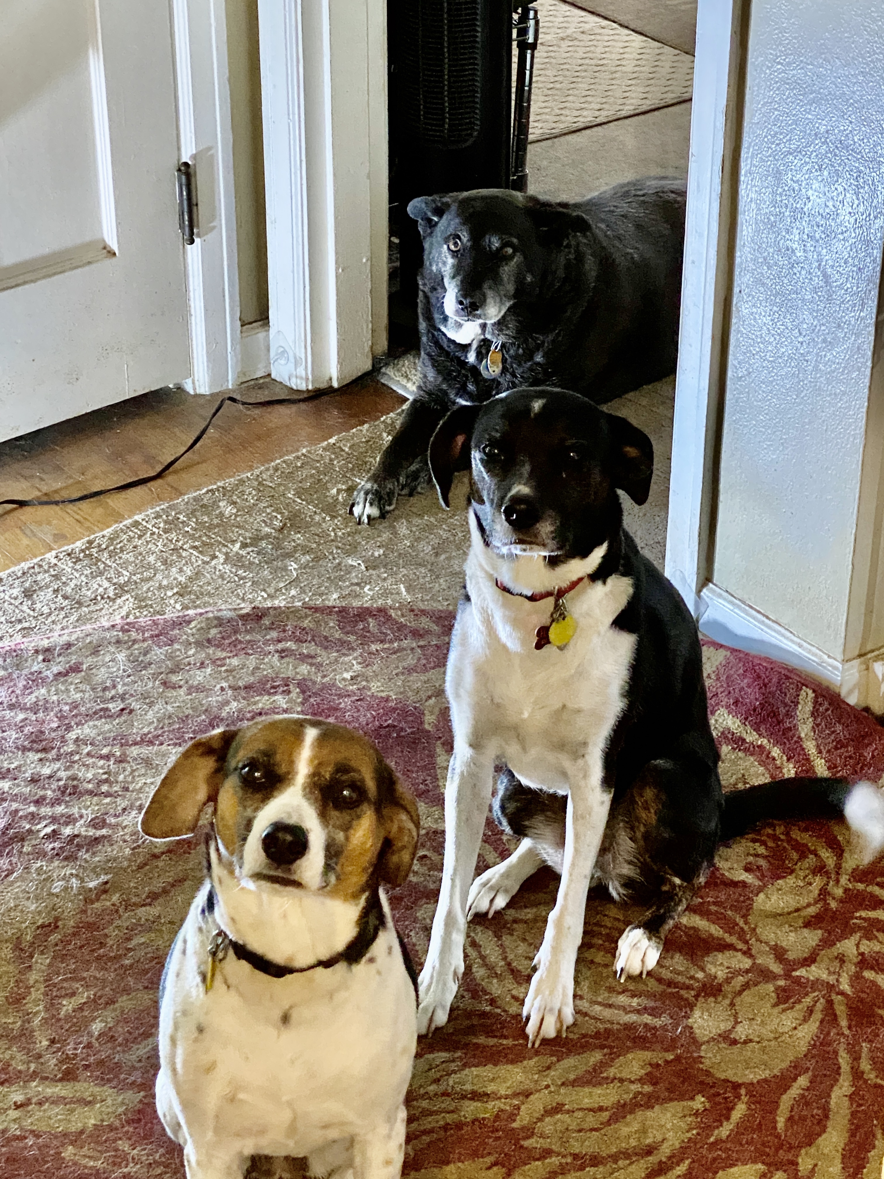 When I began the breakfast procedure at 8:00 AM, I looked into the hallway to see Erma poised for her morning. She’s so adorable when she lays with her paws crossed in front of her. As I held up my phone to grab her photo, the Heckle & Jeckle Bitches (The Sisters) rushed in for a Girls’ Photo. Since it turned out cute, I was forgiving of the Duo’s photobomb of Erma.