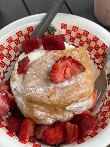 My breakfast consists of a remaining vanilla cream puff pastry from Schmidt’s Sausage Haus, topped with strawberries that barely made the cut before they became too squishy.