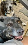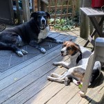 The Quartet seems to appreciate an extended amount of time on the deck and yard exploration, as well. The breeze is so busy it don’t miss a tree and Erma looks up with her head on my knee. (Yes, straight out of the Oscar Hammerstein II playbook!)
