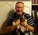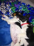 After some “getting to know you” time, I carried The Sisters upstairs, tossing them into the king sized bed which was actually two twin beds fastened together. Before climbing into bed, Chief went over to one of the high backed chairs and nibbed around for something. He came to the bed, bringing each girl a puppy blanket. I had forgotten I washed Flyer’s blankets following her death in July and set them behind the chair, out of sight. But Chief remembered and returned the blankets to use for his new sisters. If either, or both of the puppies got too close to the side of the bed, Chief would grunt; apparently, they got his message and returned to the center of the bed.