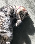 May 2018, I moved out to the deck and placed Clyde in the crate I had set up for him so he could spend time with us. A few minutes later, I heard a thud and saw that Clyde had fallen over, dead. It is assumed that both he and Neko died from a feline heart ailment that was difficult to find.