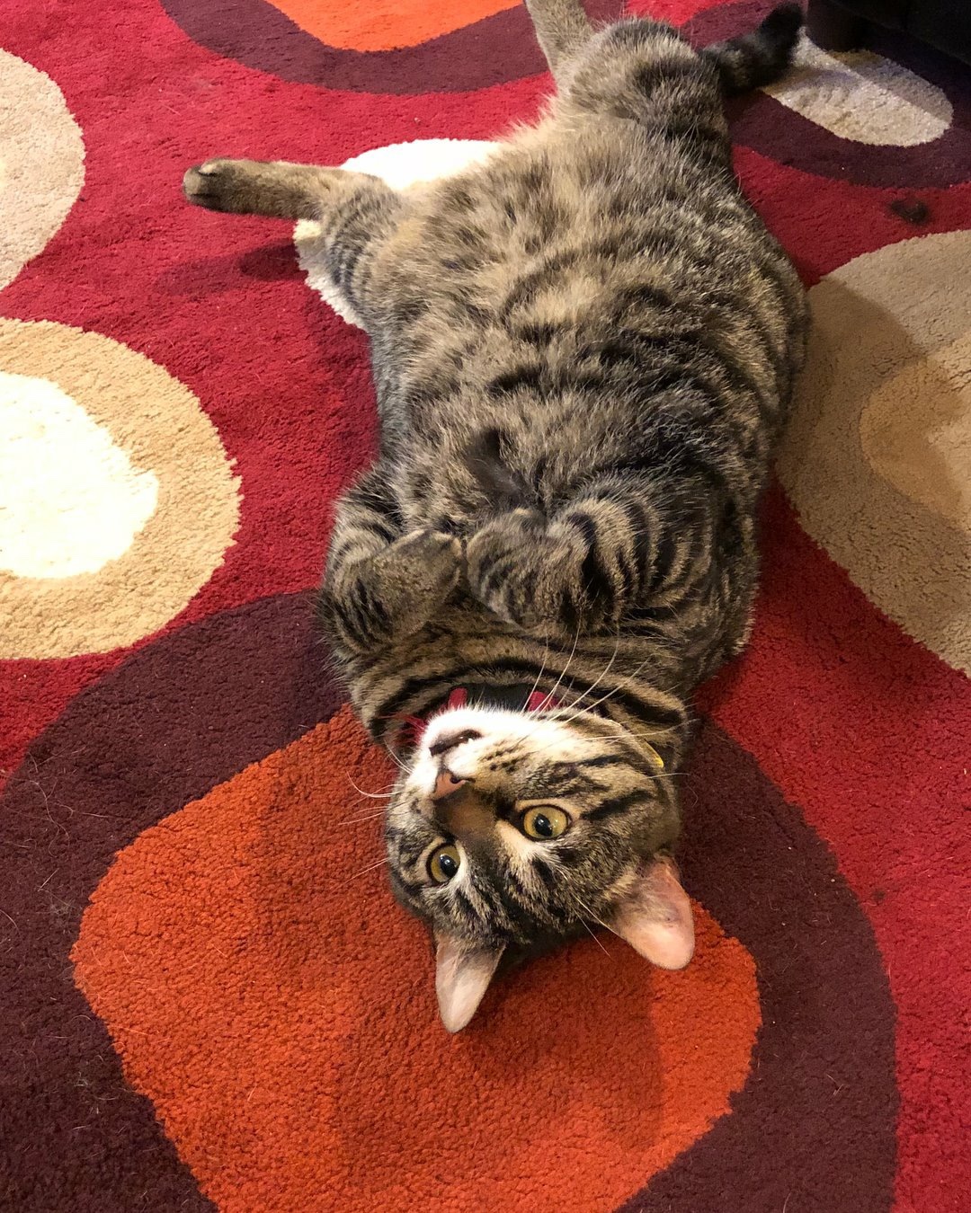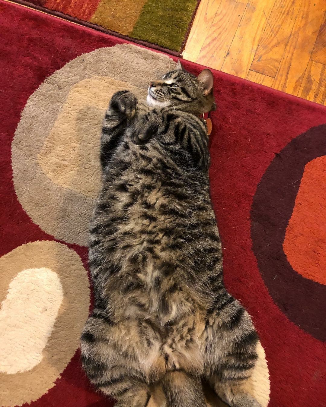One September afternoon in 2017, I was walking by PetSmart windows and I saw this very full, fat tabby cat laying on his back, his lower legs spread, and his upper arms and paws covering his face as he slept. I tapped on the window near his head. He casually pulled an arm aside, eyed me with disgust, and then offered a very agitated “meow.” Although I could not hear his sound through the window, I knew I was being cat-cussed.