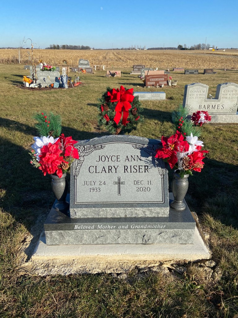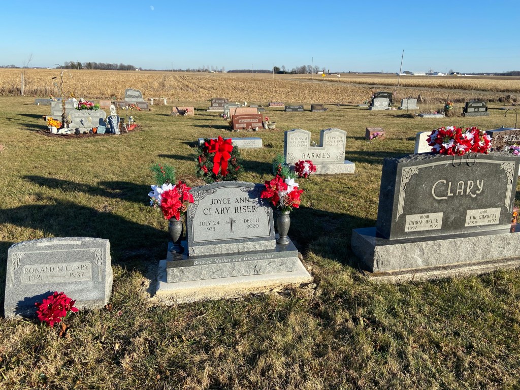 My cousin, Debbie, sent me some photos of the decorations placed on her mother’s grave in the 180 year old Forrestville Cemetery in northern Boone Township, Madison County of Central Indiana where eight generations of our Clary, Jones, Barmes, Greenlee, Ball families are buried. Aunt Joyce is buried between her brother, Ronald Monroe Clary, and her parents, Mary Belle Jones Clary and John William Garrett Clary, with my grandparents, Donna Clary Barmes and Leroy Barmes, in the row behind.