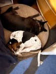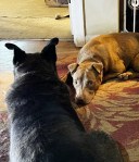 Last night, I observed several different sleeping patterns by the dogs. The one that struck me the most was seeing Erma and Bailey snuggling together. While they are cordial to one another, they are not necessarily endearing pals. Col. Deeds was all over the place to sleep next to Harrigan and Chief.