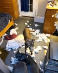 Last night, I locked all the dogs behind the gate in my bedroom. Colonel Deeds took it upon himself to decorate the bedroom, destroying two pillows.