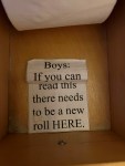 I remembered that there are two remaining signs I taped up in 2003 when we moved to Shroyer Road. One was a taped note in a drawer to remind the boys to replace a roll of toilet paper from the hall closet when they took one out of the bathroom drawer. Another note still hangs in the kitchen cabinet where I’ve always kept drinking glasses.