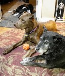 Colonel Deeds, a most loving and devoted pal, is sometimes clueless, which gives him a special kind of charm. When he hops into bed, he has no target for landing around me, and when he lies down, it is a flop. At nearly 80 pounds, he is solid muscle and I feel the painful weight of his drops. The Colonel and Hoskins each have tails like tanks and when maneuvering through the throng of wagging tails, my legs feel as though they are being battered by baseball bats.