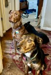 On the deck this afternoon, Chief and Erma received their first post winter fur brushing. As usual, the very short haired Harrigan pushed her way in to be brushed. I obliged, pretending to brush her, saying, “You look beautiful, Harrigan!”