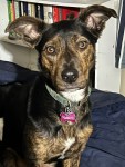 The very serious dog of the five, Harrigan is humorless with the other dogs but very attentive and possessive with me. Harrigan and her sister and littermate, Bailey, arrived at 8 weeks old on Christmas night, 2013, four days after Navi’s tragic death. In December 2023, Bailey died from esophageal cancer, and Harrigan’s grief nearly took her down. Her face has quickly grown white with age and grief, but her energy is still that of a 3 year old.