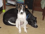 March 2, 2011, these two pups were thirteen weeks old and had been at The Haasienda for one week. Chief could hop or stretch from step to step as he climbed up the deck steps or interior stairs. Navi, however, still needed to be lifted or carried.