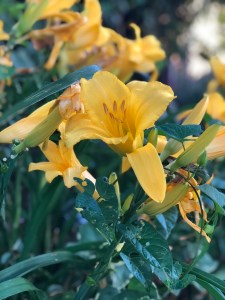 Today, only five Mary Lincoln day lilies are joining us. It appears more are to follow but their tenure is close to its end. The Rose of Sharon is filled with blooms and my neighbor’s coneflowers push through my side of the fence, which I appreciate.